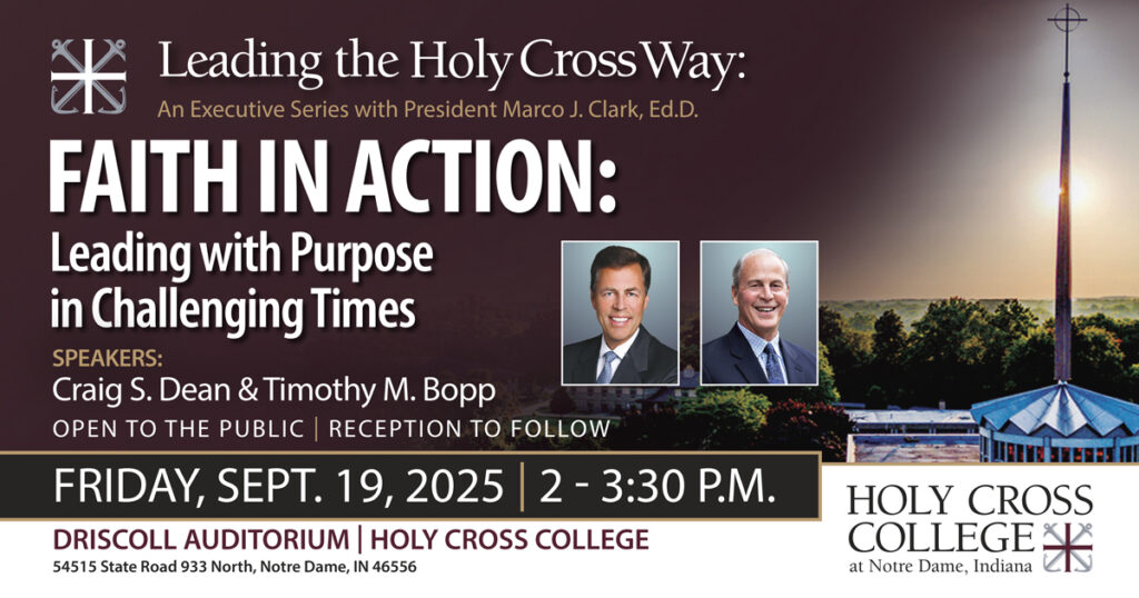 The Leading the Holy Cross Way executive series with President Marco J. Clark continues this Friday, Sept. 19, at 2 p.m. in Driscoll Auditorium with two accomplished leaders who bring decades of insight from the worlds of business and education.