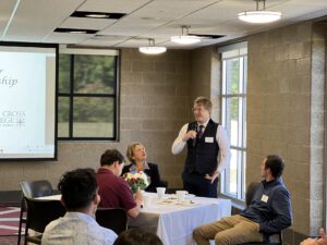 Each year, Holy Cross College gathers to celebrate the life and legacy of Spehar at the annual Nicholas Spehar Memorial Scholarship Luncheon. This year’s event, held on October 8, in the Pfeil Center Board Room, welcomed scholarship recipients, staff, and representatives from the Community Foundation of Elkhart County, whose partnership makes this scholarship possible.
