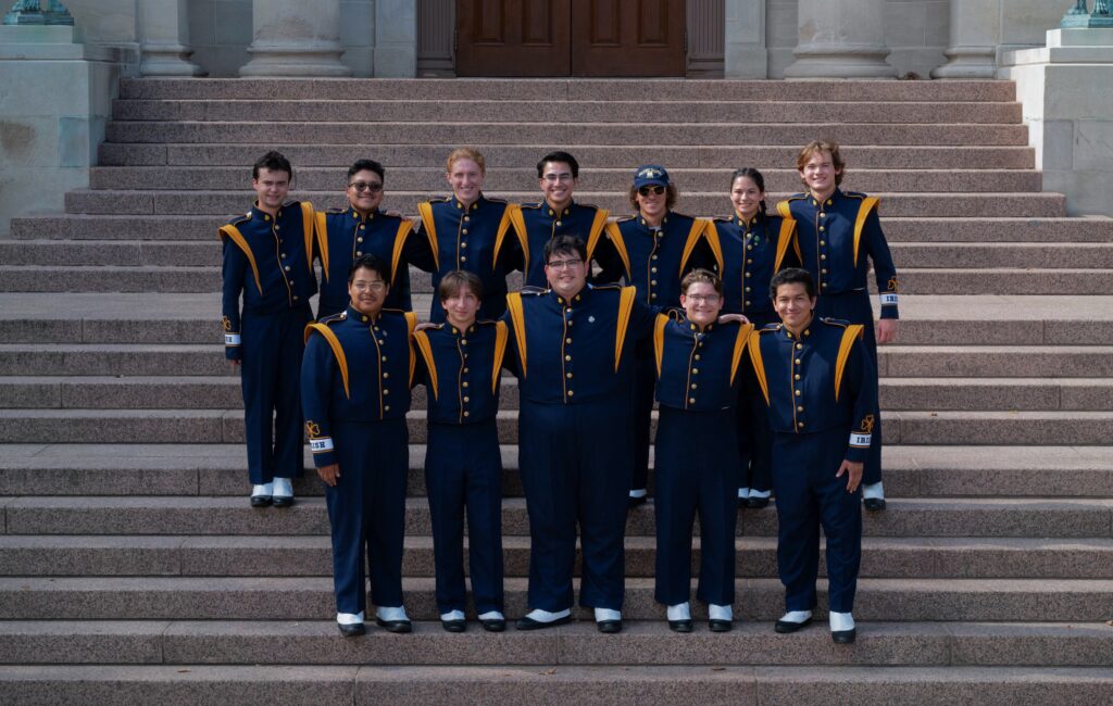 Quijada, located in the middle of the top row, is gathered with his fellow Holy Cross students who are members of the Notre Dame band.
