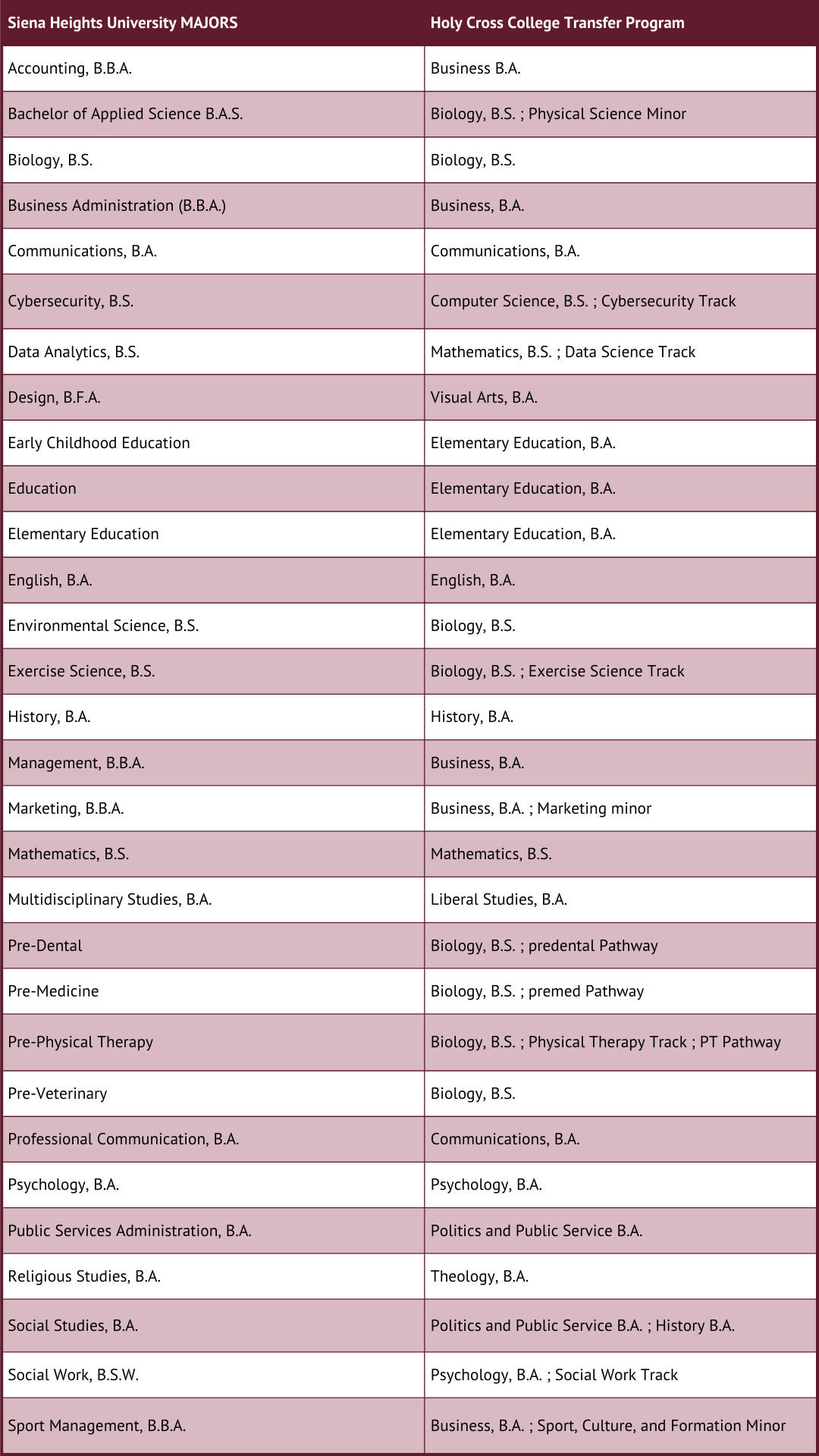 As a Teach-Out Partner, Holy Cross College will accept all credits of all Siena Heights University students currently enrolled in rolled in a program for which Holy Cross offers an equal or comparable degree. Majors are eligible for transfer according to the following table.